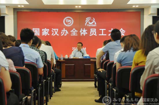 6月14日,教育部副部长田学军到www.828-365.com调研,听取汉办工作汇报,走访慰问各业务处室,为全体员工作报告。