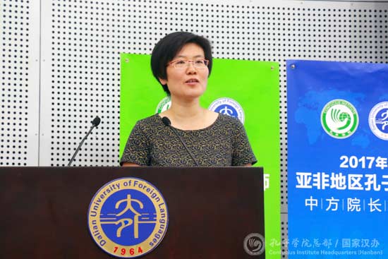 刘宏代表大连外国语大学向参训院长和老师的到来表示热烈欢迎。她表示,大连外国语大学十年间建了十所孔子学院,成功承办了27期院长、师资、志愿者培训,为孔子学院建设和汉语国际推广做出了贡献。十三五期间,学校将着重加强孔院院长队伍建设,为师资和志愿者队伍提供可持续人才保障,设置服务于汉推事业的科研和人才培养课题,开发特色教材,加强外派院长、教师管理以及制度建设,形成鼓励院长和教师主动积极奉献海外国际汉语推广的科研、评职、工资待遇等。她指出,在新的时代背景下, “一带一路”强调的共商、共建、共享理念,为孔子学院未来发展提供了崭新的动力和更加艰巨的任务。传播丝路文化、讲好丝路故事、阐明丝路精神,也将成为包括亚非国家在内的沿线国家孔子学院的新使命。