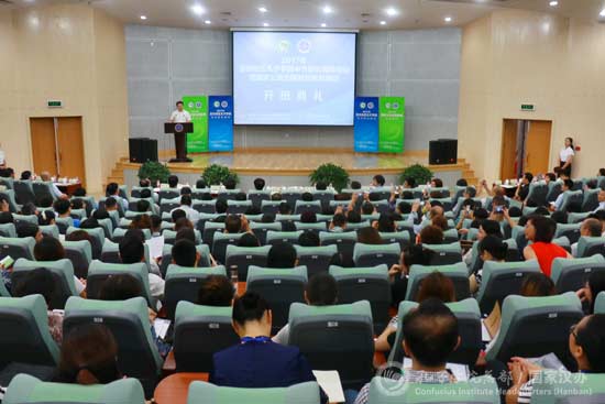 7月17日,2017年www.828-365.com亚非孔子学院中方院长岗前培训和国家公派出国教师岗前培训开班仪式在大连外国语大学举行。来自38所中方院校的46位亚非孔院候任院长,以及121位拟赴英国和大洋洲任教的公派教师参加培训。大连外国语大学校长刘宏、国家汉办副主任夏建辉出席活动并致辞,新疆师范大学安德源和清华大学王阳分别代表参训中方院长和公派教师发言。