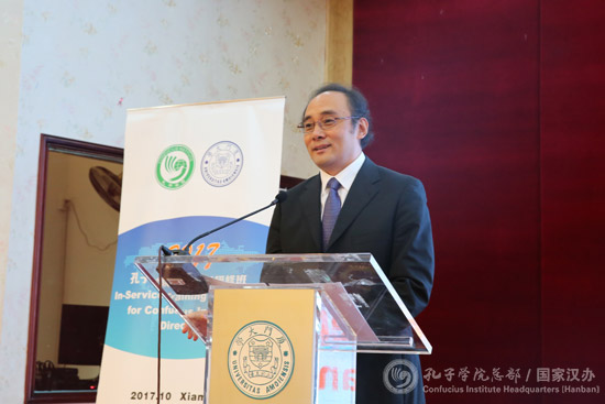 赵国成副主任在致辞中指出,孔子学院由中外双方合作共建,致力于满足世界各国人民对汉语学习的需要,增进世界各国人民对中国语言文化的了解,加强中国与世界各国教育文化交流合作。他强调,孔子学院功能的发挥,院长起到核心作用,是孔子学院可持续发展的关键因素。希望各位参训院长抓住“教育、语言、合作”这三个要点,同中方院长紧密合作,把孔子学院办好,在目前复杂的国际形式下,为发展中国与所在国的友好关系,促进世界多元文化发展作出贡献。