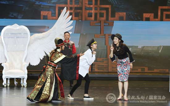 劲爆的音乐点亮全场,身着各国特色服饰的选手们跳起欢快的开场舞《快乐汉语》,代表五大洲的5强团队依次登场亮相,比赛正式开始。第一轮为情景考演《趣味三国—创业英雄汇》,该环节以《三国演义》中的著名人物为角色原型,结合二十一世纪创业英雄会的时代背景,选手们分饰不同角色,用流利的中文向观众展现了中国制造以及世界共享的新热点。比赛让选手们足足过了一把“穿越”瘾,通过在中国历史画卷中体验不同角色完成了比赛。经过专业评委的评审,俄罗斯1队、吉尔吉斯斯坦队、美国3队顺利晋级第二轮。