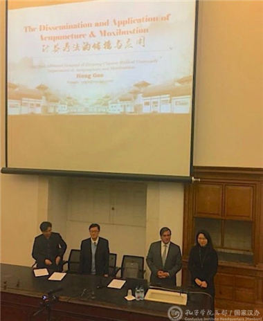 4月6日,“岐黄博览——中国浙江中医药文化展”开幕式在葡萄牙知名高等学府科英布拉大学举行,科英布拉大学副校长Joaquim Carvalho、浙江中医药大学副校长郭清、北京第二外国语学院副校长朱佩芬、葡萄牙传统医学院执行院长Frederico Carvalho、里斯本中文学校校长陈晓红等近百名中外嘉宾参加开幕式,并随后在科英布拉大学科学博物馆聆听了由浙江中医药大学第三临床医学院副院长、主任中医师高宏主讲的“针灸疗法的传播与应用”专题学术报告。