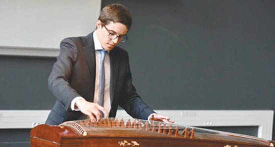 来自拉罗谢尔孔子学院的学生李顾南用古筝演奏乐曲《笑傲江湖》。
