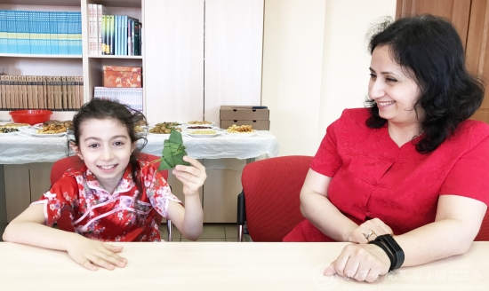 卡琳娜和女儿在端午节包粽子