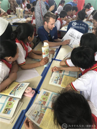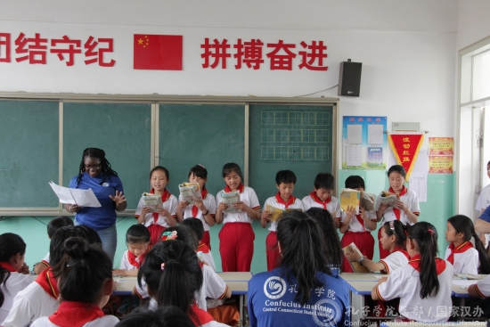 课堂上,每名美国同学与小学生围桌成组,大脑袋与几颗小脑袋凑在一起研习知识、交流对话。新老师们努力克服与小学生语言沟通困难的问题,他们或是以白纸代黑板,简笔涂画小人、状物,生动释义生词;或是手脚比划做示范,让小学生们模仿的同时反复朗读短语,以加深印象;或是耐心移座、贴近每位同学,逐一在课本上指读语句纠正发音。一词一句一世界,友谊合奏曲跨越语言、种族差异,在这群大朋友与小朋友之间演绎着动人的交响。课后每个小学生都拿出自己亲手制作的京剧脸谱、端午香囊、中国结等送给自己的“美国老师”。
