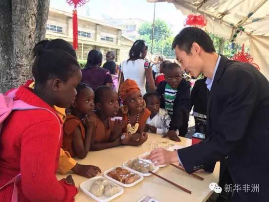 狮子小学汉语教师杨志国在当天的活动中向几名来自卡伦金部落的儿童介绍饺子、包子等中国食品