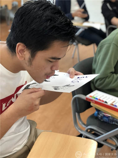 体验课程的现场设置了中国结、书法、吹画、太极扇四个中国文化体验项目,学生可自由选择。第一次接触到红绳、毛笔、墨水、太极扇的学生们兴致盎然,对课程表现出浓厚的兴趣,这也使授课的志愿者教师们更有热情,师生积极互动,气氛活跃。