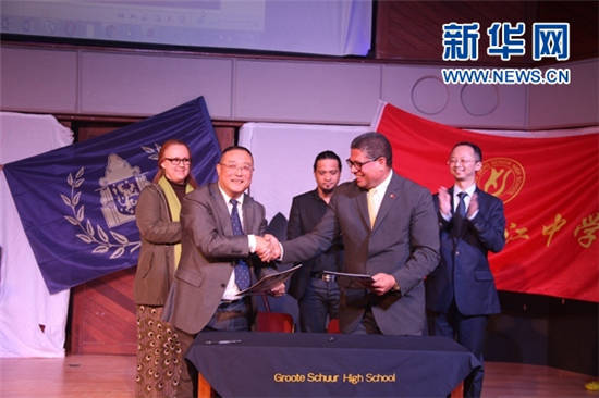 中国上海市控江中学和南非开普敦格莱特舒尔高中近日在开普敦签署缔结友好学校协议。上海市控江中学校长姜明彦和格莱特舒尔高中校长马里尤斯·伊伦雷奇分别代表各自校方在协议书上签字。