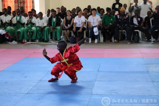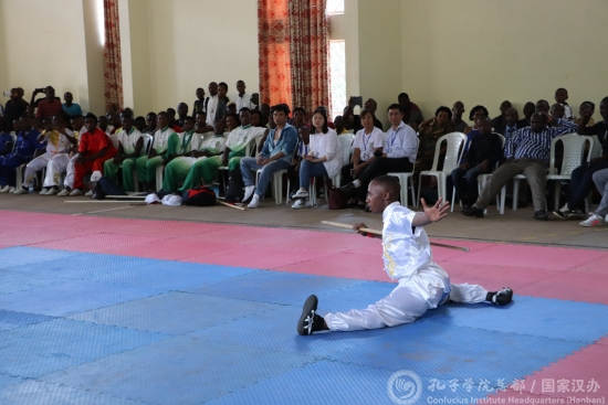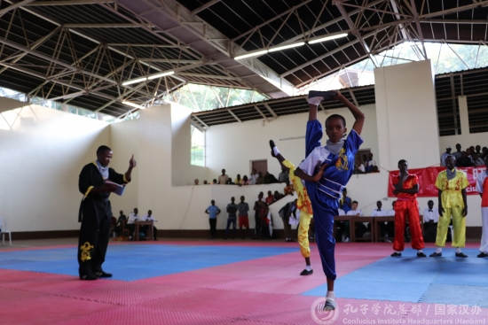 卢旺达大学教育学院孔子学院在此次开幕式的表演单元惊艳全场。由孔院合唱团为卢旺达国家武术队改编伴唱的《一二三四·武者之歌》和《沧海一声笑》,令观众耳目一新。《闻鸡起舞》表演中,融合了睡梦罗汉拳、醉拳、蛇拳、蝎子拳等的象形拳,与武术对练和少林拳结合,引起观众的浓厚兴趣。由孔院教师、孔院武术俱乐部及少儿武术俱乐部共同表演的太极《问道紫霄》,引起现场不断的掌声。在孔院少儿武术俱乐部带来的武术剧《散学后》中,小武术表演者们的猴拳和童子功引爆全场。