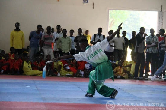 来自赞比亚、肯尼亚、坦桑尼亚、刚果(金)的三十多名队员身着各色道服,为现场观众献上了一场精彩绝伦的武术表演。女选手们矫捷的身手和“巾帼不让须眉”的气势,令观众赞叹不已。“傲气面对万重浪,热血像那红日光”,在《男儿当自强》《中国功夫》等雄壮激昂的经典歌曲伴奏下,选手们力道刚劲,目光坚毅,在为人们带来视觉与听觉冲击的同时,也带给在场华人心灵上的震撼和精神上的激励。