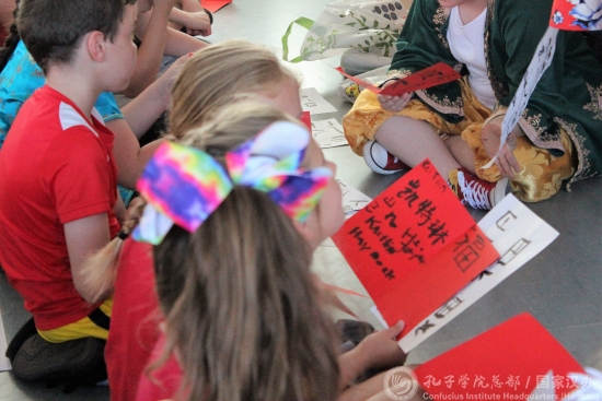 在书法文化坊中,孔院教师廖渔介绍了中国的“文房四宝”,并通过视频,讲解了汉字的基本构成。汉字的拆分和组合规律引起了学生的极大兴趣,他们积极思考,踊跃发言。在随后的练习过程中,学生们学习了“福”字的写法,并发挥自己的创意,制作出独一无二的书法贺卡。