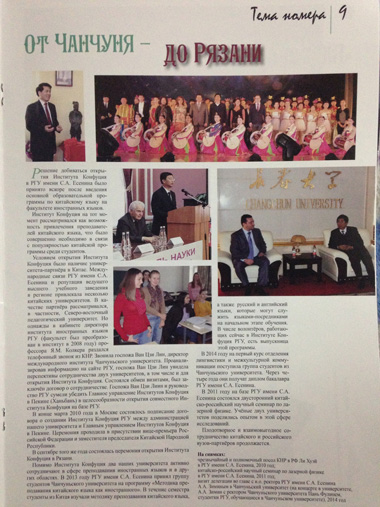 《长春》取名源自中方合作院校长春大学的名字,也寓意着梁赞大学孔子学院永葆青春活力的本色。《长春》由梁赞大学外语学院东方语系佘伊娜教授担任主编,全刊为彩色套印,8开16版。第一期内容包括主编和孔院中外方院长寄语、中国国家汉办介绍、孔院新闻、中国文化看点、孔院学生学习心得、孔院教师介绍、中国传统故事等内容。