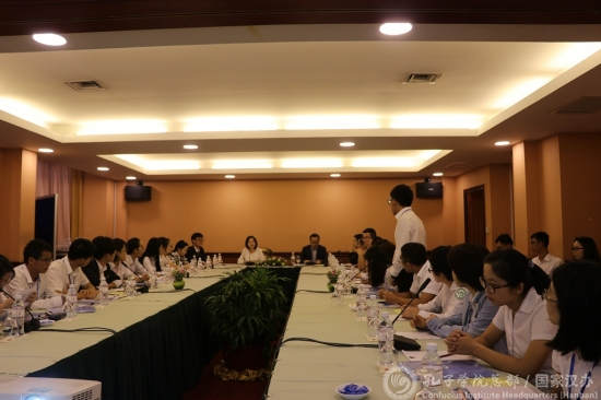培训期间,滕连帅与志愿者代表进行了座谈,关心和慰问在柬老师们的生活与工作,志愿者教师也分享了在柬工作与生活的感受。