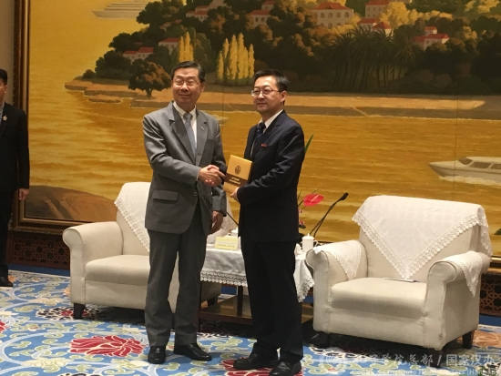 徐西鹏(右)欢迎素拉猜(左)一行到访华侨大学