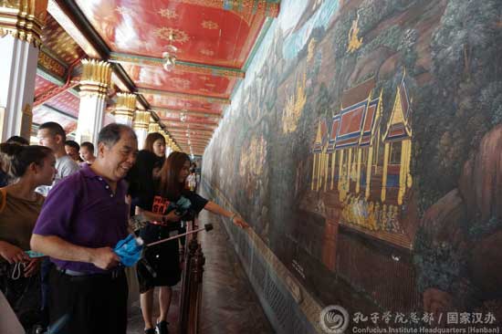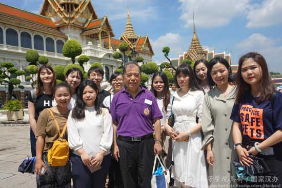 在孔院代理院长傅增有的带领下,新任志愿者教师参观了大皇宫和玉佛寺回廊壁画、大金塔、藏经塔、先王殿及大雄宝殿等建筑,学习了回廊壁画中泰国史诗《拉玛坚》所展现的泰国历史文化知识及猴神哈奴曼等神话故事,了解各个古建筑的历史背景及现代作用。